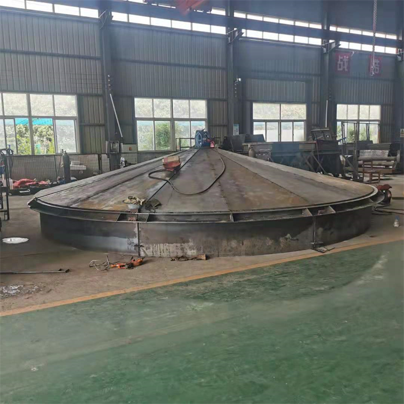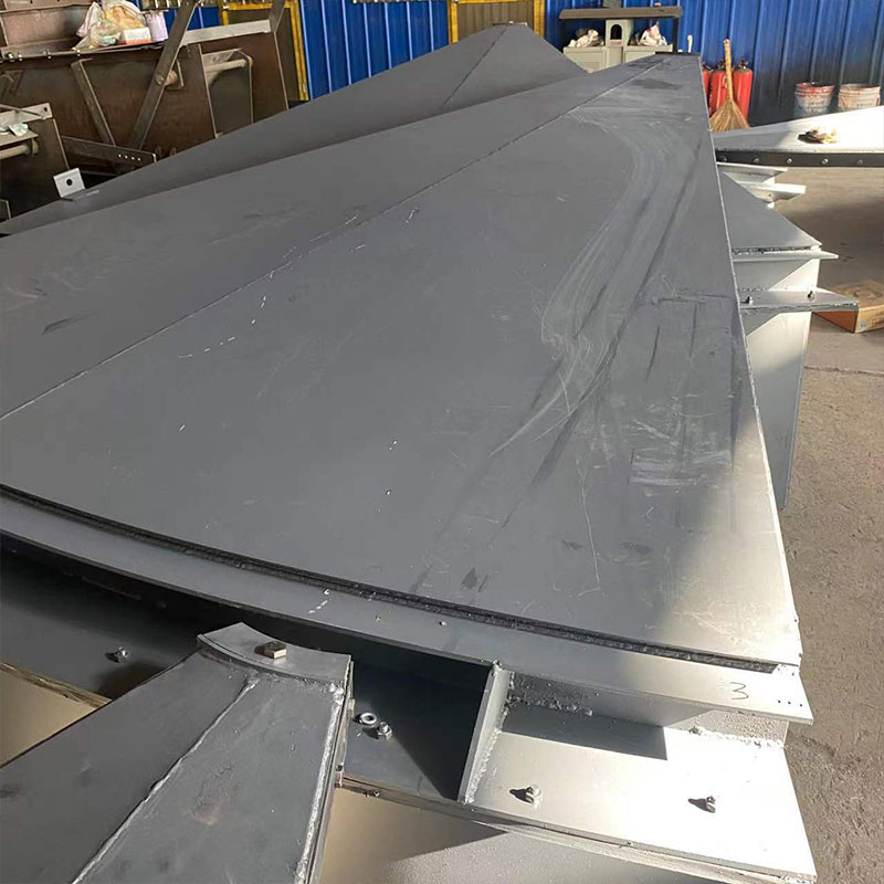 防爆盖:通常采用锥角 30° 的截锥形圆锥壳体顶盖结构,由圆筒形立壁及外密封圈等三部分焊接为一体。根据井筒直径不同,门体有四块(用于井筒直径 φ3 米 -φ4.5 米)和八块(用于井筒直径 φ5 米 -φ7 米)两种组合方式,块与块之间通过角钢搭接并夹以胶垫用螺栓紧固。